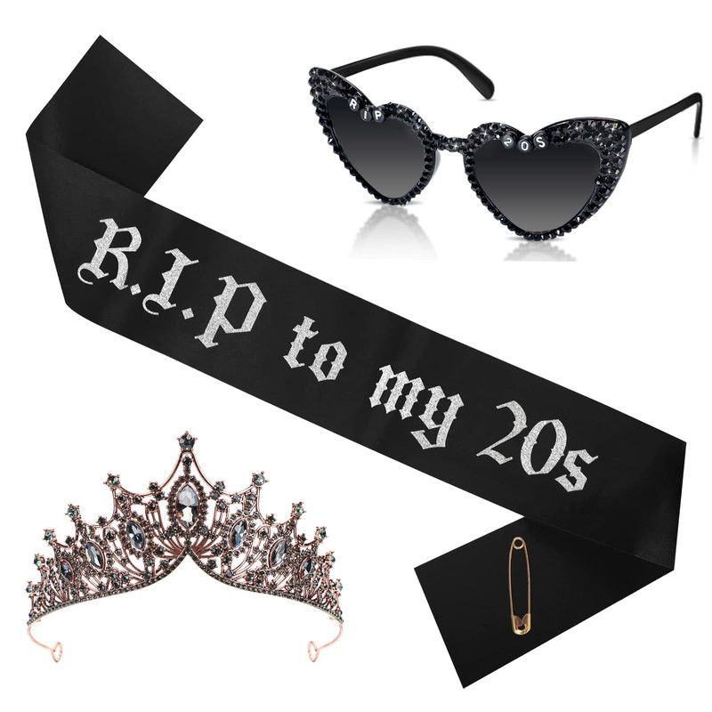 - ·Unique RIP to My 20s Sash and Crown Set:This birthday sash and crown black set includes a stylish rip to my 20s sash(4*30 inch),a dazzling bronze gold crown (2.75*5.7 inch),and a pair of birthday party sunglasses(2.7*5.7 inch) with black frames,grey lenses, black rhinestones,and letter beads—perfect birthday party accessories for women turning 30.