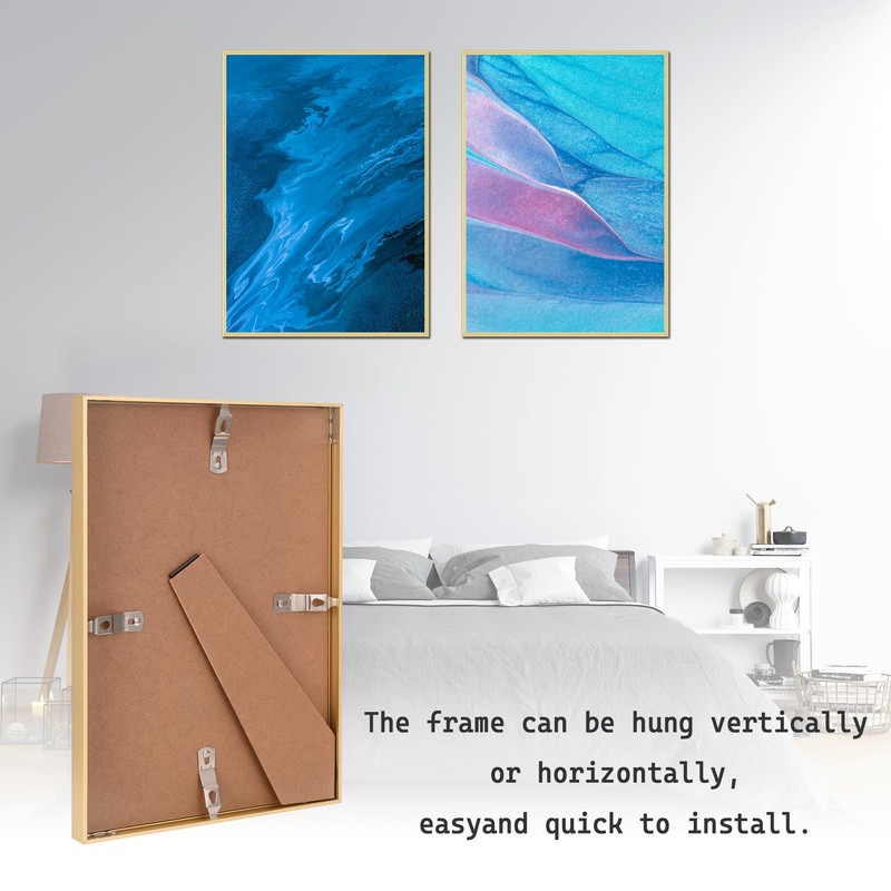 - EFFORTLESS INSTALLATION - 2 Built-in metal hooks for portrait or landscape display, the sleek gold design of our A4 poster frame coupled with its simple structure makes installation a breeze, just 4 steps that you can finish the installation! (Peel off the protective film before use).