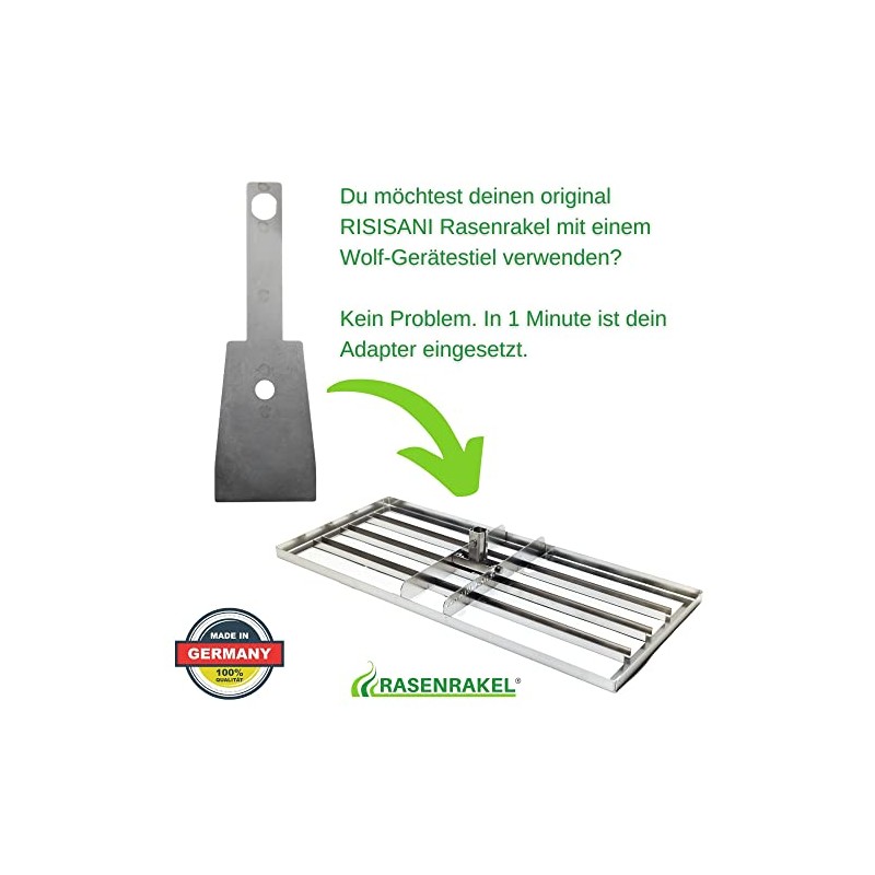 The RISISANI handle adapter is the ideal addition to professional garden maintenance. Made from high quality stainless steel, it provides a precise fit for the original RISISANI lawn squeegee and is compatible with the Wolf handle system. The handle adapter ensures optimal control and pressure when squeezing. The quick and easy installation in just 1 minute allows immediate use for first-class lawn care. Our stem adapter provides maximum flexibility in lawn care setup. Compatible with the Wolf handle system, you can design your individual configuration according to your needs. Experience efficient work at the highest level. Thanks to the premium production in Germany, you can rely on first-class quality. The adapter ensures stable and durable performance to meet your garden maintenance needs. It is designed to fit the original RISISANI lawn squeegee and landscape rake and offers an optimal addition to professional applications. The installation of the adapter is very easy and requires no special tools. Within 1 minute, the adapter is ready to use and allows you to scrape a smooth lawn. Enjoy the practicality and efficiency of this high quality adapter. We offer a lifetime warranty to secure your investment. Trust in first-class materials and first-class results. Experience the benefits of the RISISANI stem adapter and take your lawn care to a new level.