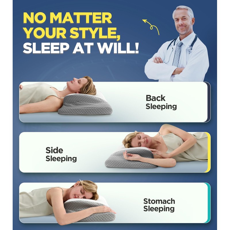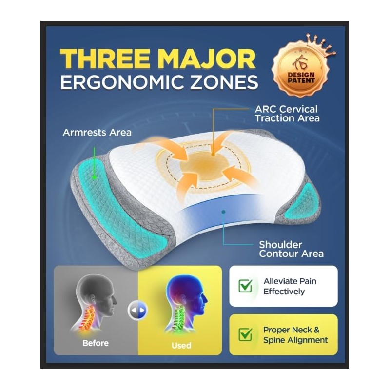 - NEWEST DESIGN! PAINLESS SLEEP! Indulge in an unparalleled sleep experience with RISRON ergonomic pillow! Featuring a concave center to better cradle your head. This differential height formation ARC cervical traction area, naturally conforms to your body curve, creating a perfect 15 angle, to align your spine properly. Thanks to the crescent-shaped design, our pillow provides 5X support and ample space without any sense of pressure. Resulting in a 70% reduction in your neck/shoulder pain.