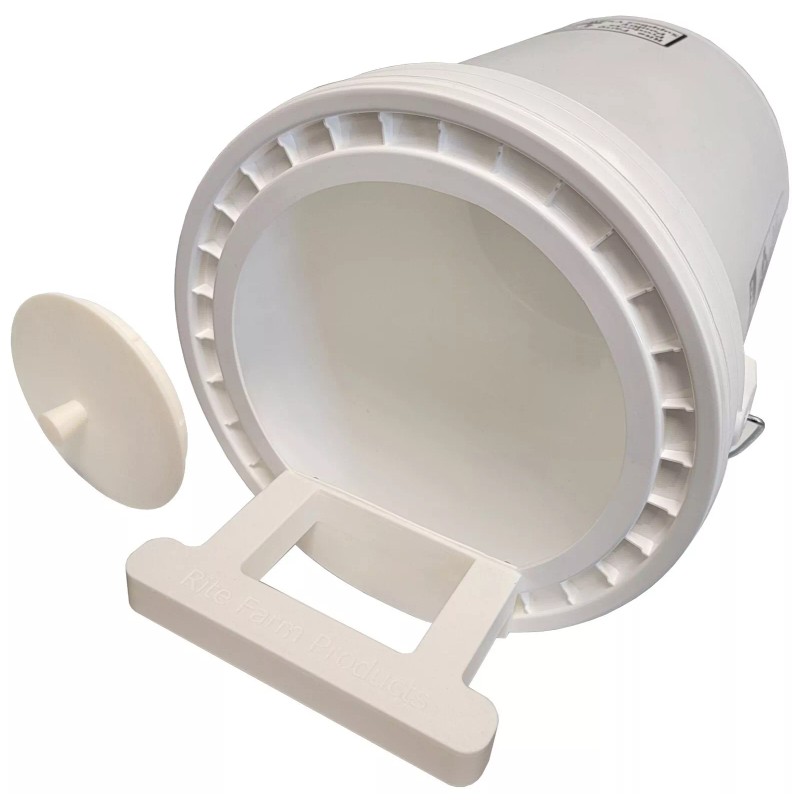 Rite Farm Products strong, washable poly nesting box bucket with rear access cover and includes a 5-gallon bucket that is drilled with the rear access cover installed. This model is for collecting the eggs from the rear of the bucket from the outside of the coop. You will need to jig saw cut an 11.25-inch circle into your coop for the bucket to fit through. 12 inches long by 12 inches wide by 20 inches deep overall, including perch and knob. Perch is 8 inches wide, and cover is 6.5 inches wide, with a 1-inch-long knob. Made in the USA in Saltillo Texas.