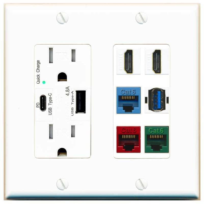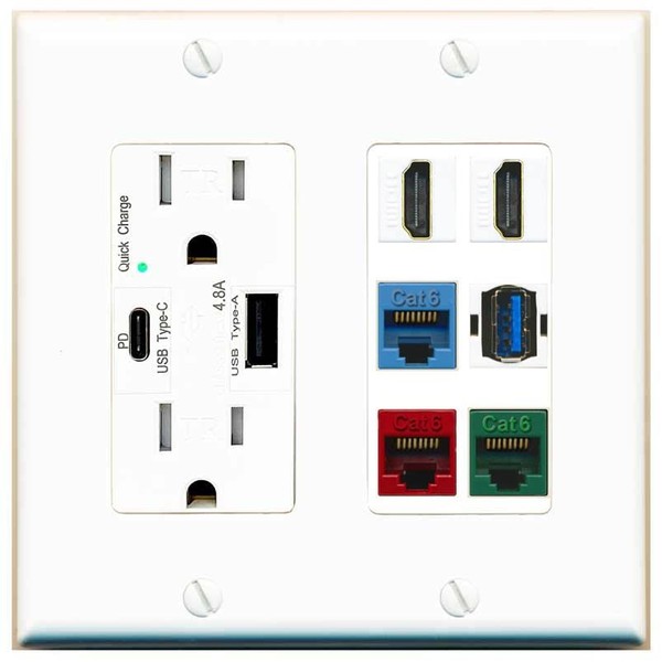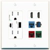 RiteAV 2 HDMI 3 Cat6 Ethernet USB3 Mixed Color Wall Plate - USB A+C Charger Outlet [White/White]