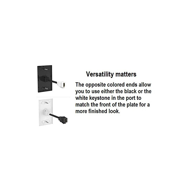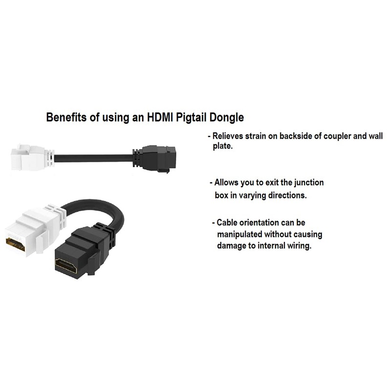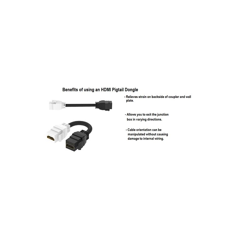 RiteAV's HDMI Pigtail Dongle is easy to install and enables you to make your connection in no time, due to the toolless, feed-thru design. Simply populate any standard-sized keystone port with one end, then plug your existing HDMI cable into the opposite end of the pigtail on the backside of the wall plate. Our 8 inch Pigtail Dongle provides you the flexibility to exit the gang box in varying directions and is useful in situations where depth is a concern, since it allows the cable orientation to be manipulated rather than requiring a 90 degree connection. This also helps to relieve stress and strain on the backside of the coupler, making for a more secure connection. The sturdy construction of the pigtail dongle ensures a long service life and the gold plated contacts provide superior connectivity. Since it's female to female by design, you can also use the pigtail as an extension cable to lengthen the distance of two male to male HDMI Cables, without the use of a wall plate. This discreet solution enables you to route your cabling through the walls and results in a clean, professional look behind wall mounted televisions, monitors, projectors and entertainment centers in both residential (home theater) and commercial (classroom, boardroom, factory floor, recording studio, etc.) settings. We offer a variety of color options to suit specific needs as well as preconfigured wall plates with anywhere from one to six ports populated with the pigtails, so please check out our full line of Wall Plates and accompanying cables. We can also customize any plate to suit your needs. Our pigtail is a cost-effective, reliable solution. (Please note that wall plates and HDMI Cables are not included. They are mentioned in the listing for reference purposes only.)