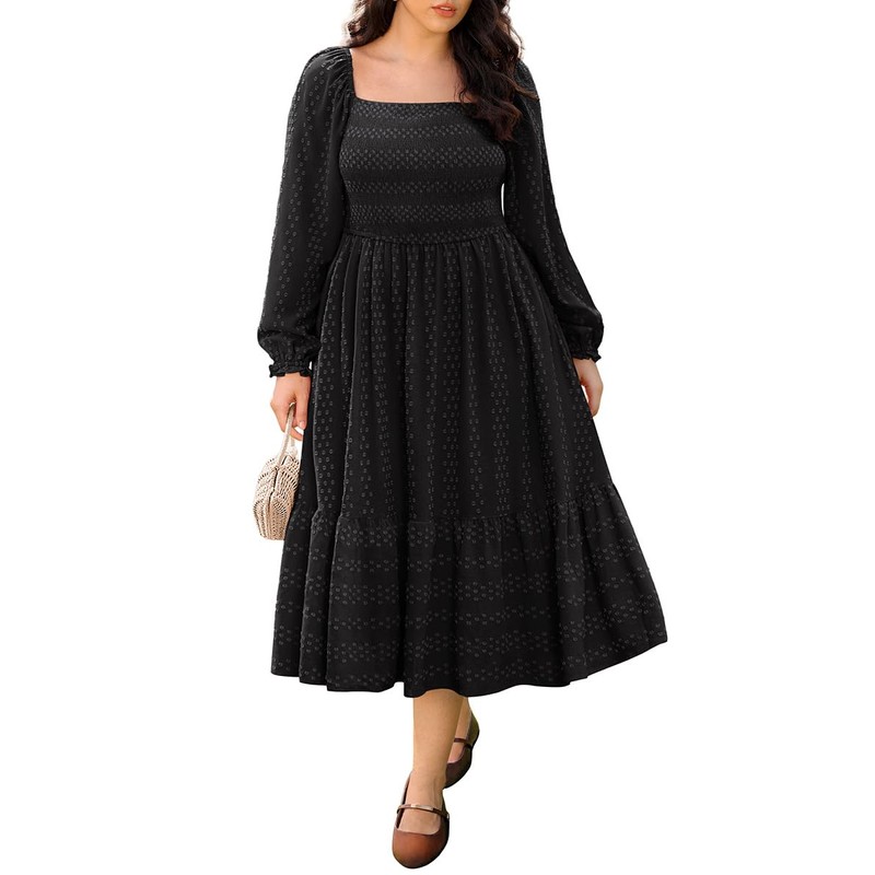 RITERA Plus Size Fall Dresses for Curvy Women Maxi Wedding Guest Dress Black Lantern Long Sleeve Smocked Square Neck Dresses Swiss Dot Spring Winter Womens Maternity Dress with Pockets 5XL 26W 28W