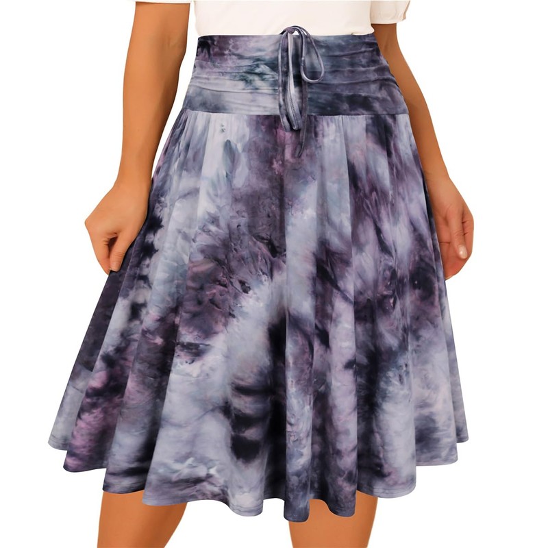 RITERA Plus Size Skirt for Women Knee Length Ruched Waist Blue Gray Tie Dye A-Line Pockets Flowy Skirt Casual Stretchy Elastic Skater Basic Flared Midi Skirt 2XL 18W 20W