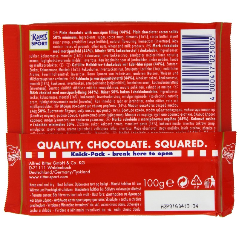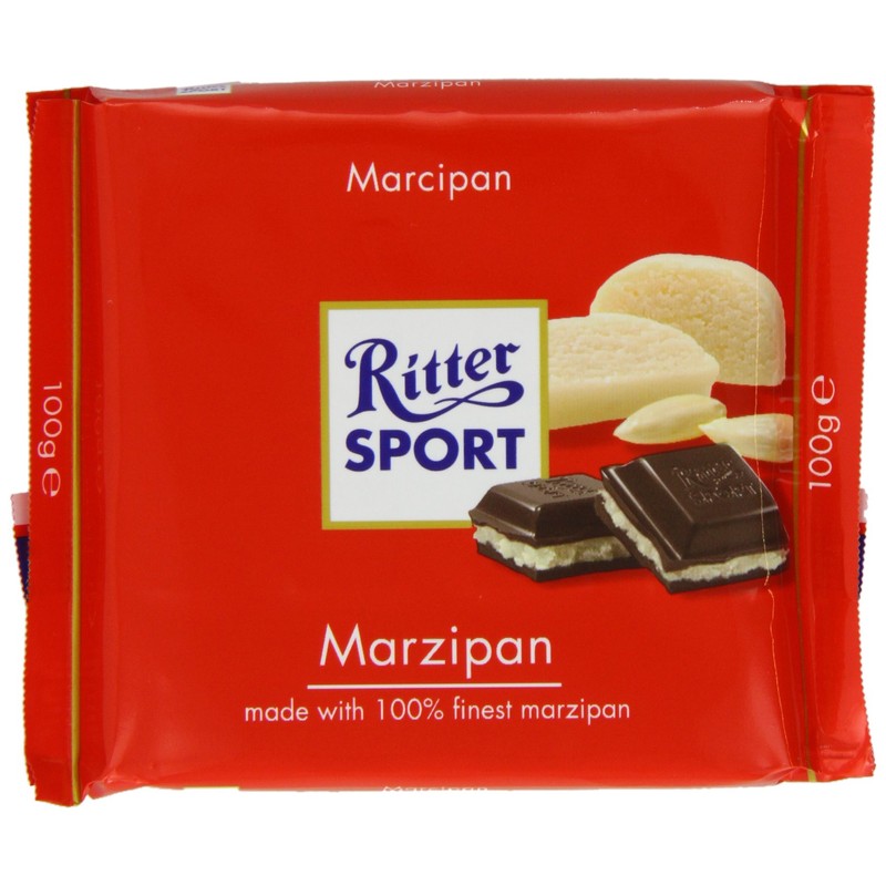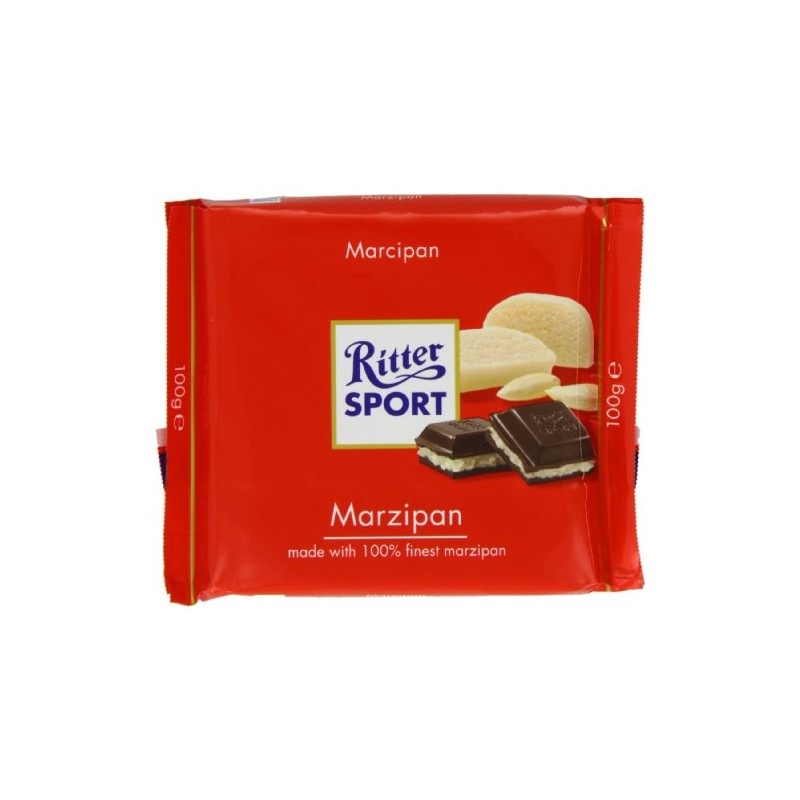 Delicious Ritter Sport Dark Chocolate with Marzipan filling, with a resealable wrapper, imported from Germany. Store in a cool and dry place.