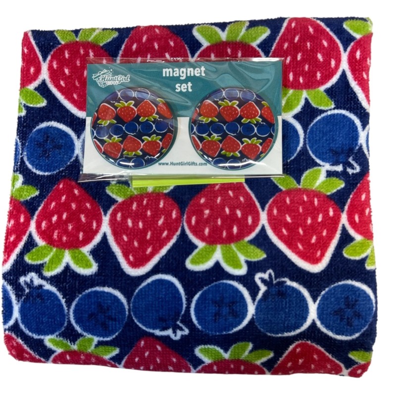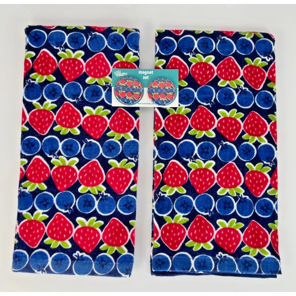 This bright blueberries and strawberries printed towel set includes two (2) John Ritz brand spring farmhouse berries cotton, terry, dish towels and two (2) 1.5" strong refrigerator magnets.