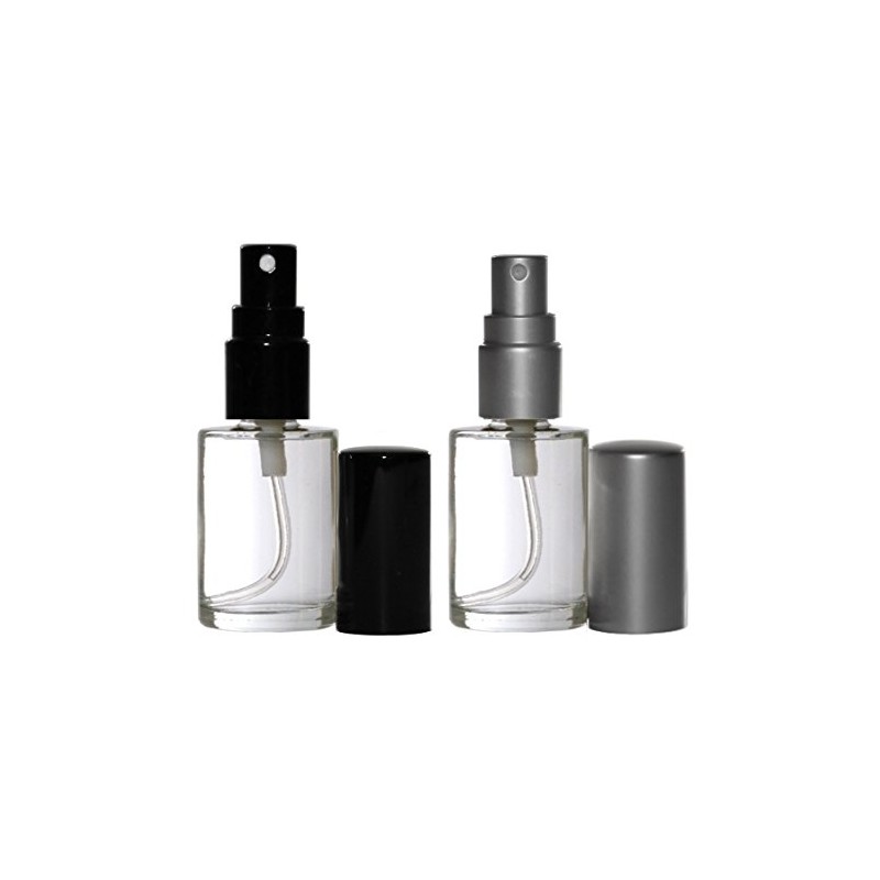 **Riverrun** fragrance atomizers, with sturdy round glass bottles and attractive glossy black and shiny silver metal sprayers and caps. Provides a fine mist spray. A funnel and transfer pipette are included, making it easy to fill the bottle. Decant your favorite fragrance in style. Capacity: 15 ml ~ .50 oz. Height: 80 mm ~ 3.15 in. Width: 27 mm ~ 1.06 in.