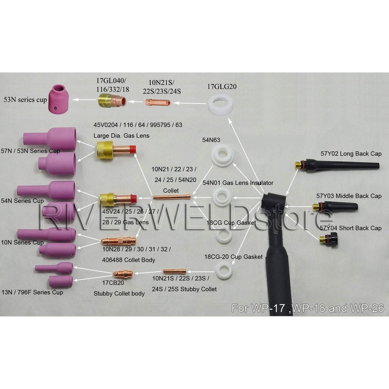 RIVERWELD Large TIG Gas Lens Alumina Nozzle Ceramic Cups Kit 53N87 12# 3/4" 53N88#10 5/8" 53N89#15 15/16" 57N74#8 1/2" 57N75#6 3/8" Fit SR DB WP 9 17 20 18 26 TIG Welding Torch 5pk