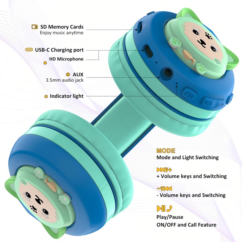 - 【Unique Design】: This foldable headset combines music, light and color elements.The RGB cat's eye flashes and changes colors to the rhythm of the music playing. Short press the M button to switch between 4 flashing modes. The cat cartoon image brings joy to every family and adds fun to children's daily life.