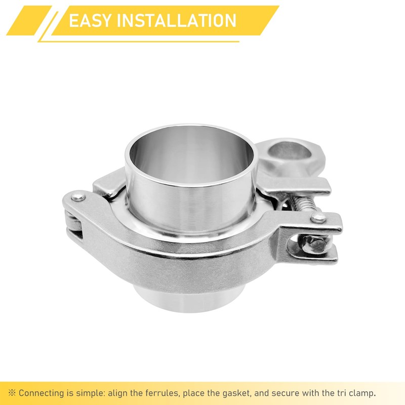 - 【Product Specifications】①Tri Clamp Size: 1.5 inch ② Ferrule OD: 1.99" (50.5mm), Tubing OD: 1.5" (38mm), Length: 0.83" (21mm) ③Connection: Compatible with 1.5" sanitary tri clamp fittings, featuring a 1.5" (38mm) tubing OD and 1.99" (50.5mm) ferrule OD ④Package Contents: 2 Short Weld Ferrules, 1 Tri Clamp, and 1 Silicone Gasket.