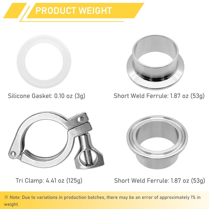 - 【All-In-One Solution】The tri-clamp short weld ferrule kit provides a reliable and hygienic connection for sanitary process lines. The kit includes 2 short weld ferrules, 1 tri-clamp, and 1 silicone gasket, offering a complete solution without the need to purchase separate components.