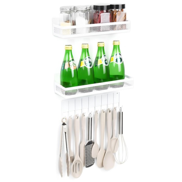 Rixordd 3-Pack Magnetic Spice Rack for Refrigerator, Moveable Shelf with 10 Hooks, Fridge Organizer for Kitchen Storage, White