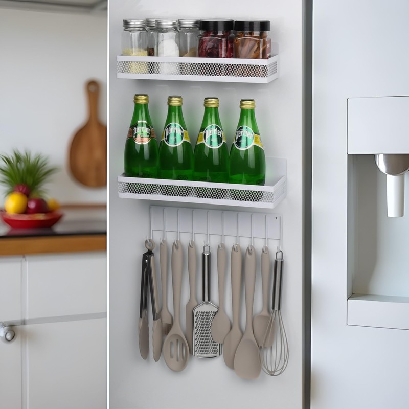 - 【3-Piece Magnetic Organizer Set】Includes two magnetic shelves and one 10-hook hanger to store spices, utensils, or small items on metal surfaces like refrigerators or microwaves.
