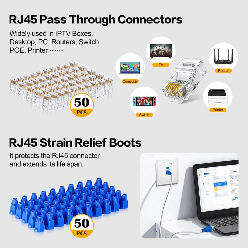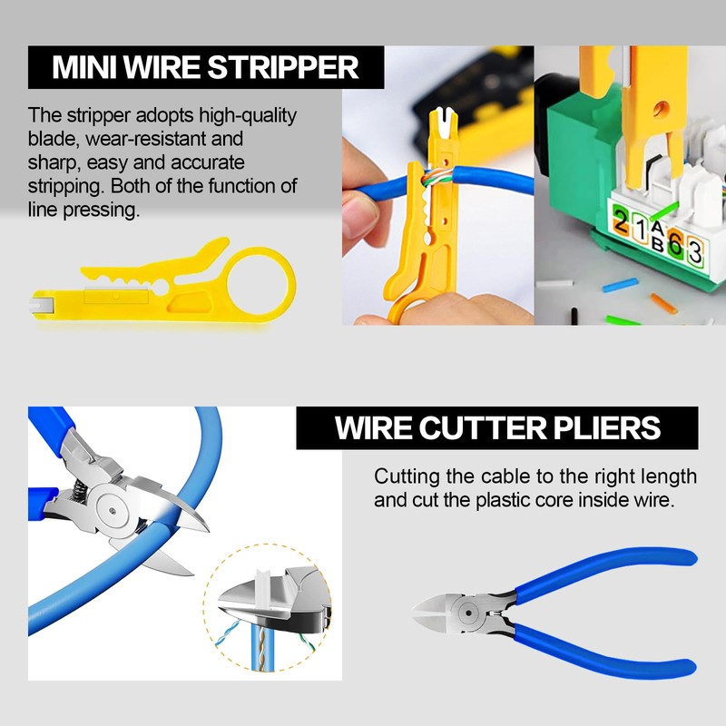 - 【RJ45 Crimp Tool Kit】The kits included Pass Through RJ45 Crimper tool with a set of spare blades, RJ45 Network Cable Tester, Wire Cutters Pliers , Network Cable Stripper, Mini Cable Stripper, 50PCS RJ45 CAT6 Pass Through Connectors and 50PCS RJ45 Strain Relief Boots.