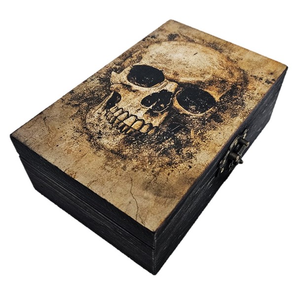 Beautiful Wooden Skull Face Trinket box to hold all your sentiments Measures approximately 6.5 x 4.25 x 2.25 inches A beautiful display in the bedroom, dresser, nightstand, curio cabinet, shelf, etc. Ideal gifts for friends, family, relatives, occasions like birthdays, Christmas, Thanksgiving, Anniversary, etc. We are a small family business and stand behind our product! Please let us know our product's shortcomings if any, so we can improve upon those moving forward! Unique Remembrance Gifts for your loved ones to forever touch their hearts remind them of their loved ones!