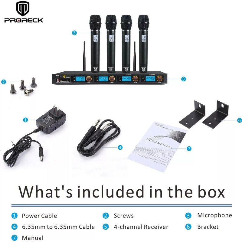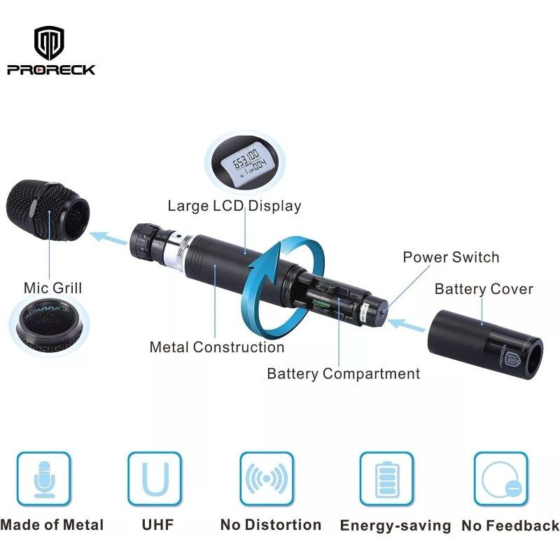 • UHF microphone system delivers clear and loud audio signal and is much more stable than the VHF; Work great with all PRORECK speakers; Four XLR outputs and one 1/4 inch (6.35mm) mix output.