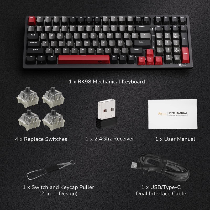 - 【Three Modes Connection & Versatile Interface】This wireless keyboard offers three connection modes: wired, Bluetooth, and 2.4GHz wireless, making it easy to switch between three different devices. RK98 wireless mechanical keyboard also features both USB and Type C interfaces, along with a Type C to USB data cable for convenient connectivity with various devices