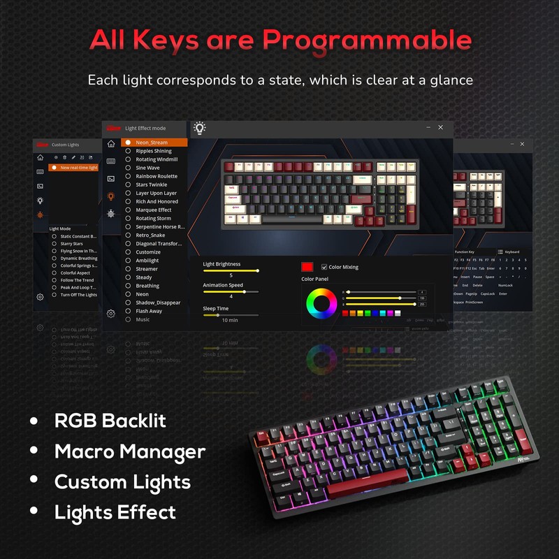 - 【Compact Layout & Four Indicators】The RK98 mechanical keyboard features 100 keys laid out in a 98% compact design with no gaps, resulting in a sleek and space-saving keyboard for gamers. Additionally, this gaming keyboard is equipped with four indicators to clearly display its status and remind you to charge