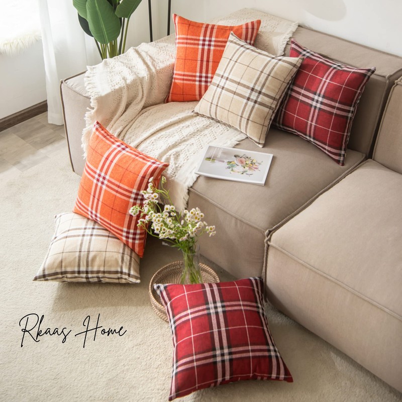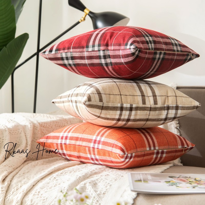 ★RKAAS HOME Decorative Luxurious Tartan Check Square Cushion Cover for Living Room Sofa Couch Bed 45cm x 45cm 18x18 Inches (Pack of 4 - Red)