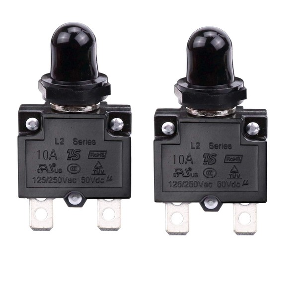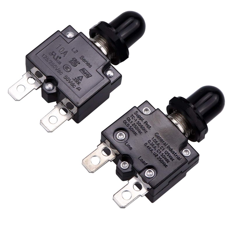 RKURCK 10 Amps Push Button Circuit Breakers, AC 125/250V DC 50V Thermal Overload Protector with Quick Connect Terminals and Waterproof Button Black Cap, Manual Reset Thermal Circuit Breaker 10A(2 Pcs
