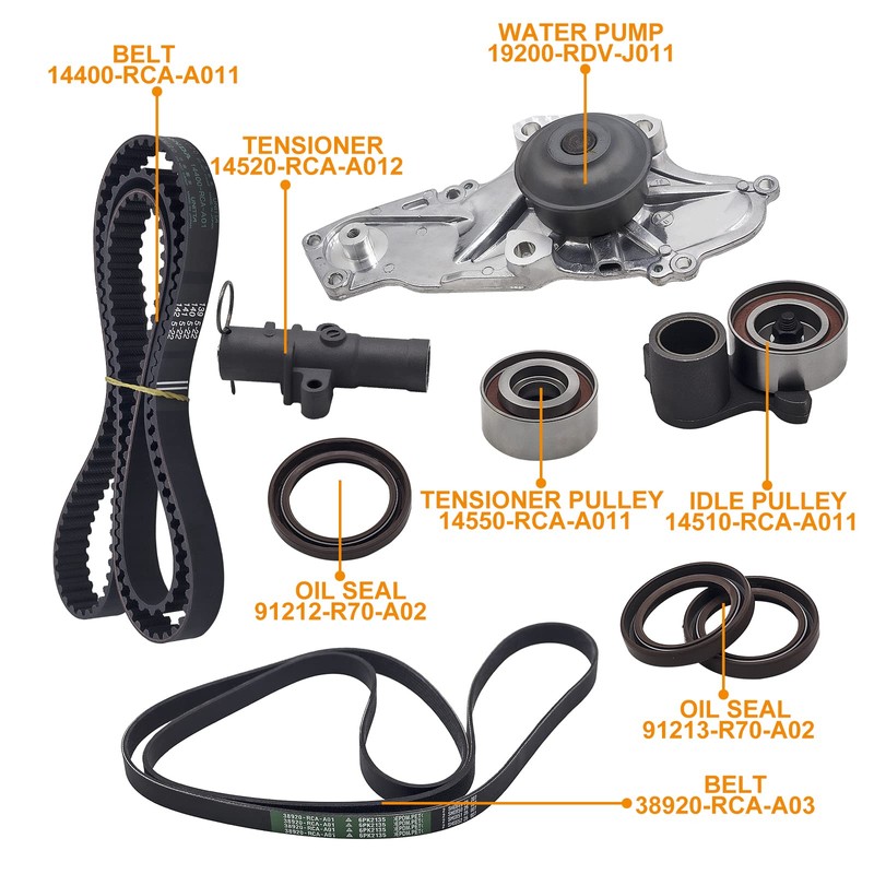 - đăREPLACE NUMBERăWater pump 19200-RDM-A02/19200-RDV-J01, Timing belt 14400-RCA-A01, Serpentine drive belt 38920-RCA-A03/6PK2135, Tensioner roller 14510-RCA-A01, Idler roller 14550-RCA-A01, Hydraulic tensioner 14520-RCA-A01, 2 Pcs Camshaft seals 91213-R70-A02/91213-RP6-A01, Crankshaft seal 91212-R70-A02