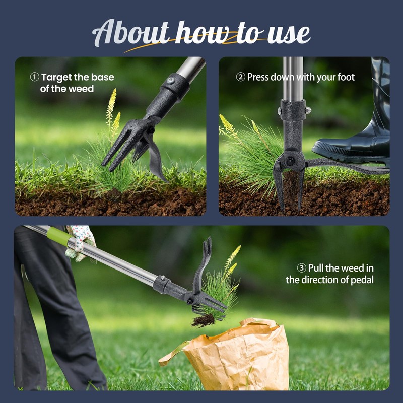 - Durable Construction: Our weed control tool divided into a 3-section steel handle and a sturdy 4-claw steel head for efficient weed extraction.The metal parts made of sturdy stainless steel and high-strength steel. Rust proof and durable, able to withstand long-term outdoor use.