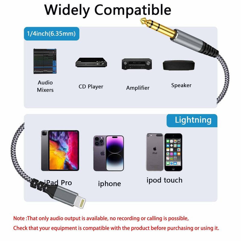 - ♪ [10FT Lightning to 6.35mm 1/4 TRS Audio Stereo Cable] Simply connect the audio signal from your smartphone, tablet, or laptop with a Lighting port output connector to your home Hi-Fi system, car stereo, speakers, amplifier, or any other device equipped with a 1/4 connector, it is the best choice for music lovers. (Note: The 6.35mm (1/4") port on this cable is for output only; this adapter cannot be reversed for 6.35mm (1/4") to Lighting audio recording) ***Audio playback only, cannot be used for recording or calling, ***Not applicable to car audio Check that your equipment is compatible with the product before purchasing or using it.