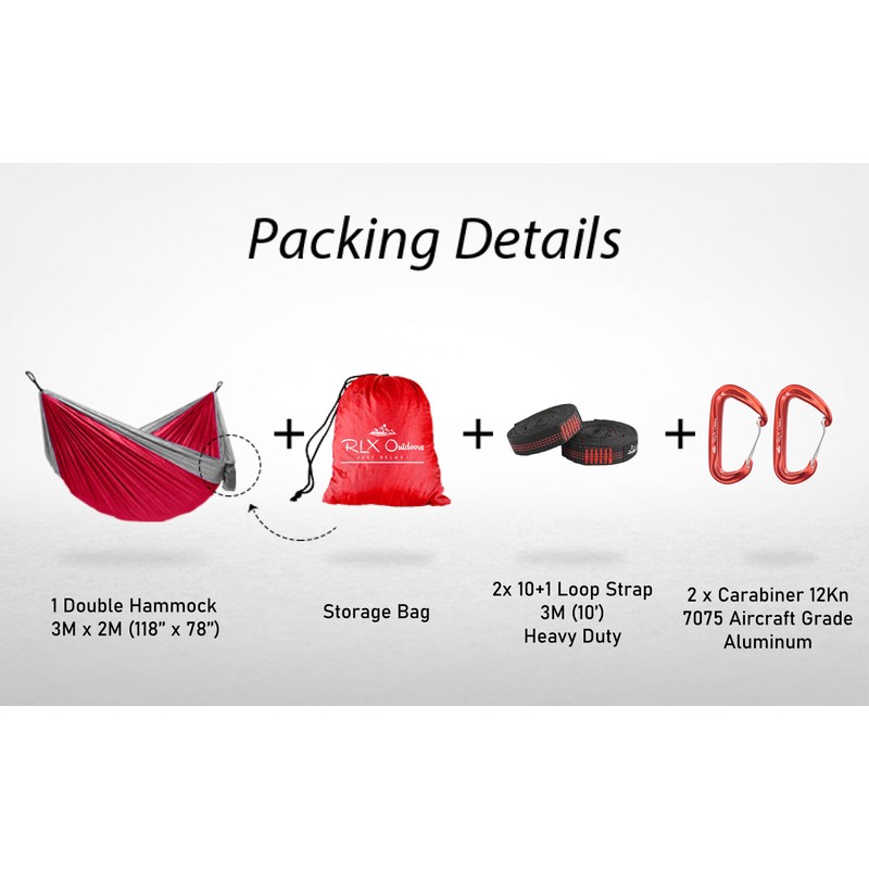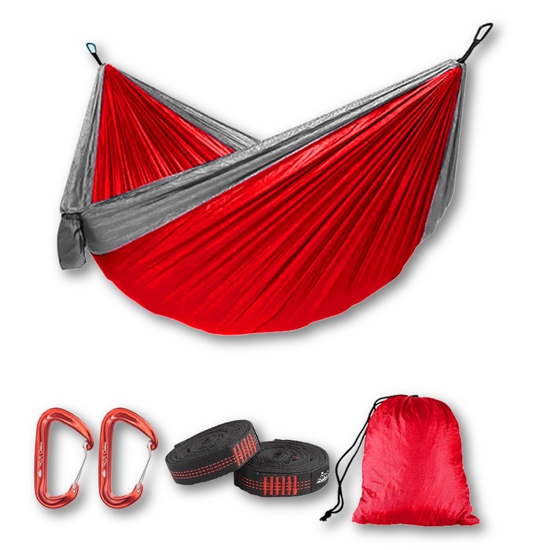 RLX Hammock (Red, Double) Camping Hammock, Lightweight Parachute Nylon, 550 lbs Capacity, with 2 Carabiners, two10 Foot (10+1) Heavy Duty Loop Straps and Built-in Storage Bag. Colors May Vary.