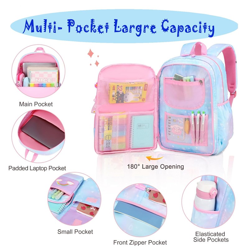 - 【Multi-Pocket Large Capacity】kawaii backpack Main pocket for books, notebooks, binder, and padded compartment pocket for Ipad and laptop, making it effortless to sort and store your belongings. backpacks for kids with elasticated side pockets on both sides for water bottles and umbrella.