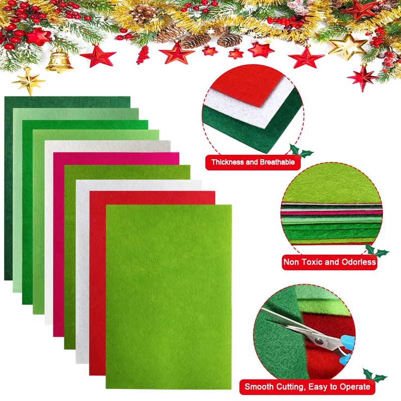 • Bright and beautiful colours: felt crafts include ten different colours, six different greens, two white and two red tones. These colours match the Christmas atmosphere very well and can be used to make different Christmas decorations to make your Christmas family warmer and more beautiful.