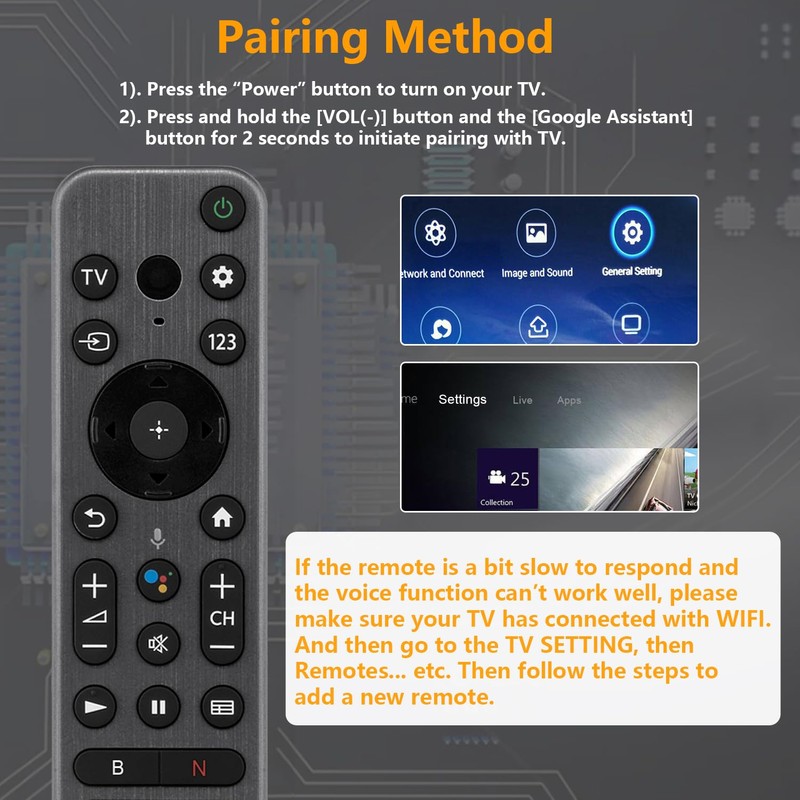 • Pairing steps: 1). Press the "Power" button to turn on your TV. 2). Press and hold the [VOL(-)] button and the [Google Assistant] button for 2 seconds to initiate pairing with TV. 【If the remote is a bit slow to respond and the voice function can't work well, please try to re-pair it by this way: Select the "TV Settings" on the homepage, then select "Remotes & Accessories" and select to add a new remote, then follow the steps to add a new remote.】