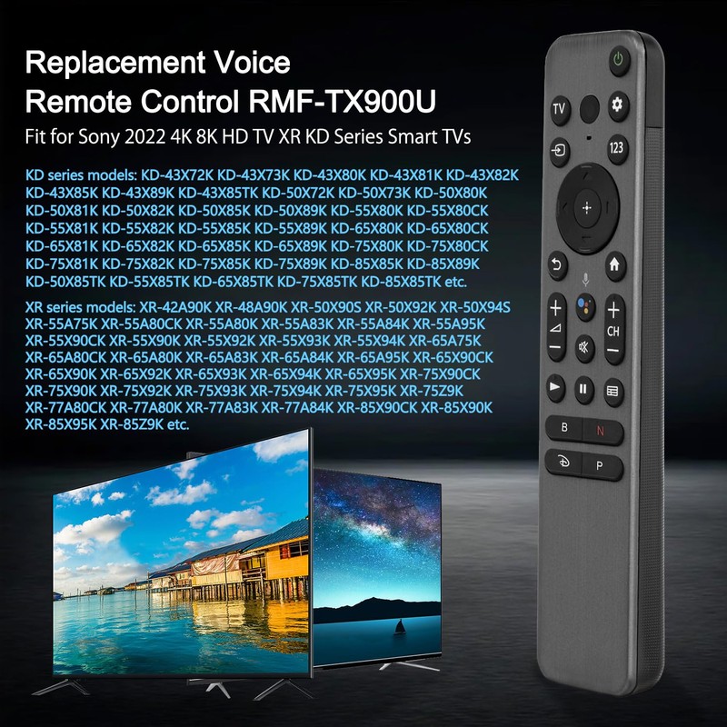 • RMF-TX900U voice remote control works for Sony Bravia 2022 4K 8K HD smart TV KD and XR series. Lost your original one? Broke your original one? Just buy it! With ABS cover and sensitive keys, it is the ideal choice to meet your needs. 【Package List: 1*Remote Control for Sony TV(2*AAA batteries and instructions are NOT included!)】