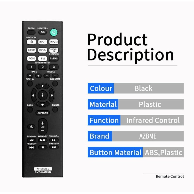 - Remote Model: RMT-AA400U / RMTAA400U.Compatible with Sony AV Receiver model STRDH190 STR-DH190.