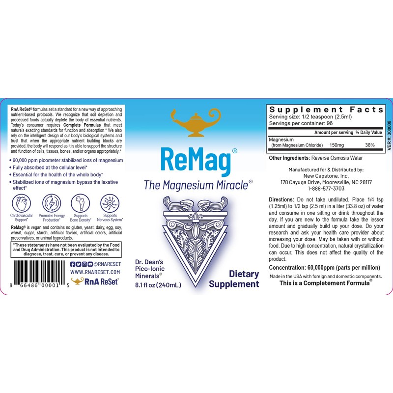 - HIGHLY ABSORBED MAGNESIUM CHLORIDE - ReMag Liquid Magnesium Solution is made through a proprietary 18 point process which turns magnesium chloride into a 60,000ppm concentration of stabilized picometer ions of magnesium. Designed to optimize absorption and bypass gastric upset. 99.99% pure.
