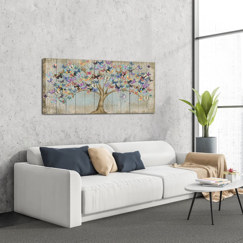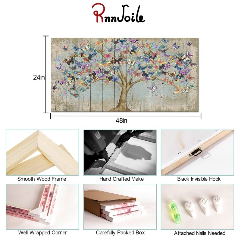 RnnJoile Butterfly Canvas Art Framed Rustic Tree of Life Wall Print Wood Background Painting Picture for Farmhouse Cabin Decorations Ready to Hang 24 x 48 Inch