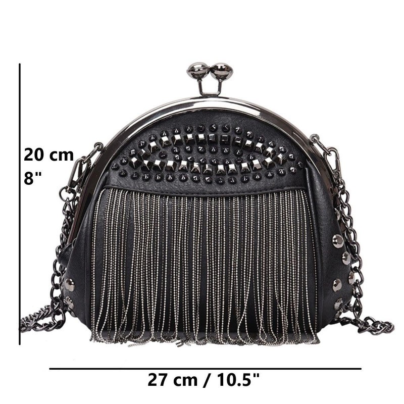 - Perfect for Gothic & Alternative Fashion – Whether you're heading to a party, festival, or just adding a rebellious flair to your everyday look, this studded and tassel-accented bag is the ideal accessory for those with a love for dark, edgy fashion.