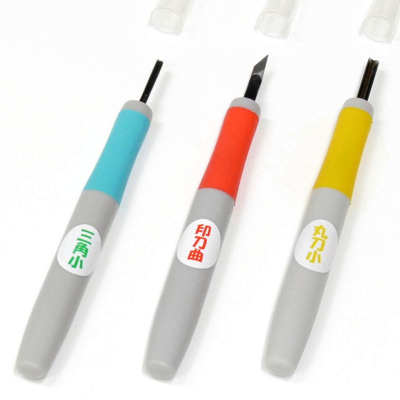 - Stamp blade (curved) 0.18 inch (4.5 mm), round blade (small) 0.12 inch (3 mm), triangular blade (small) 0.06 inch (1.5 mm), double layer steel, with safety cap Handle: Elastomer resin