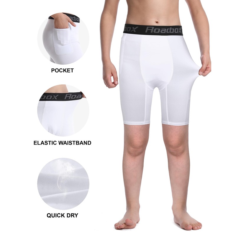 Roadbox Boys Compression Shorts, 2Pack Youth Athletic Underwear with Pockets, Spandex Base Layer for Kid Football Running