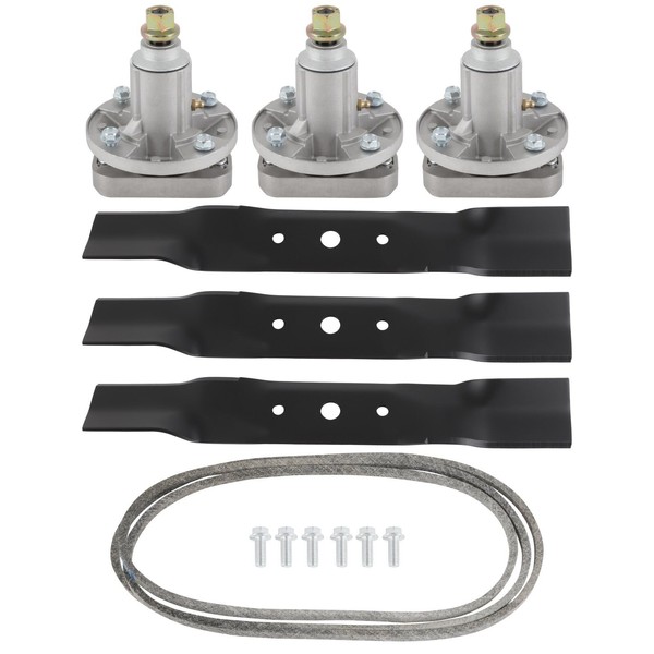 - Package Information: 1 drive belt, 3 spindle assembly, 3 mower blades for replacement