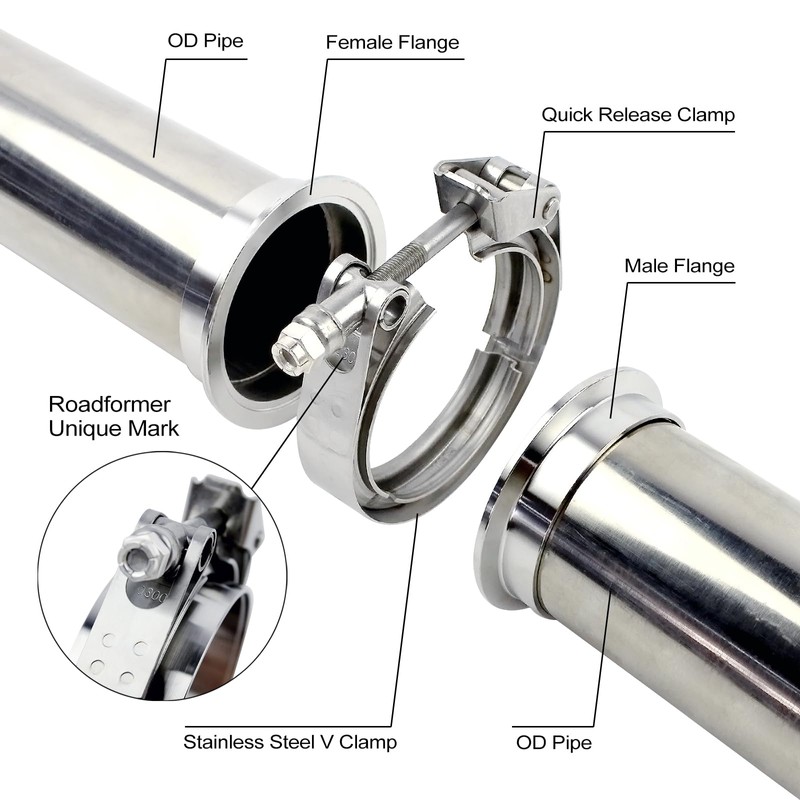 - STAINLESS STEEL - ROADFORMER V Band Clamps with Male/Female Flanges is used to join 3" OD Pipes. T-Bolt size: 1/4"-28 thread hardware