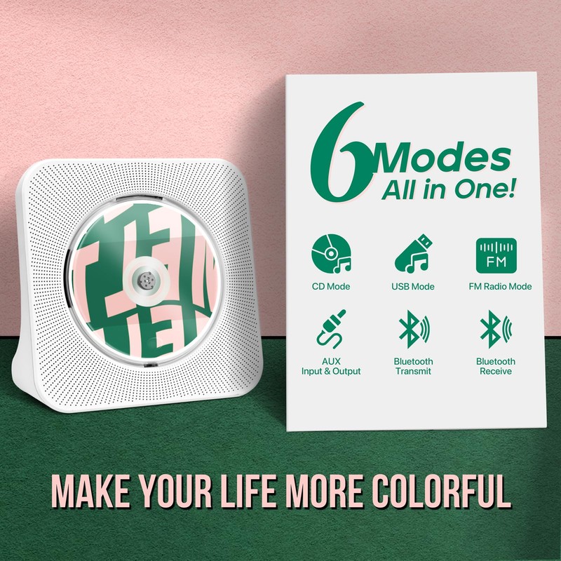 - 8-in-1 Multifunctional CD Player ROADOM cd player features up to 8 functions including CD, Bluetooth transmitting,Bluetooth receiving,FM Radio,U disk, AUX,Timer and Repeat. CD function is widely compatible with five cd formats including CD, CD-R, CD-RW, MP3, and WMA