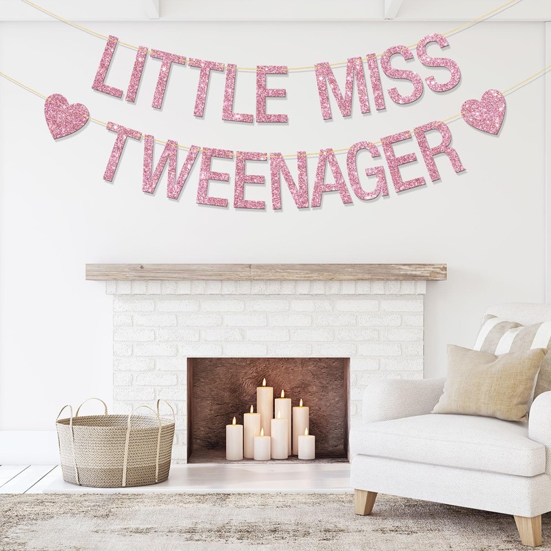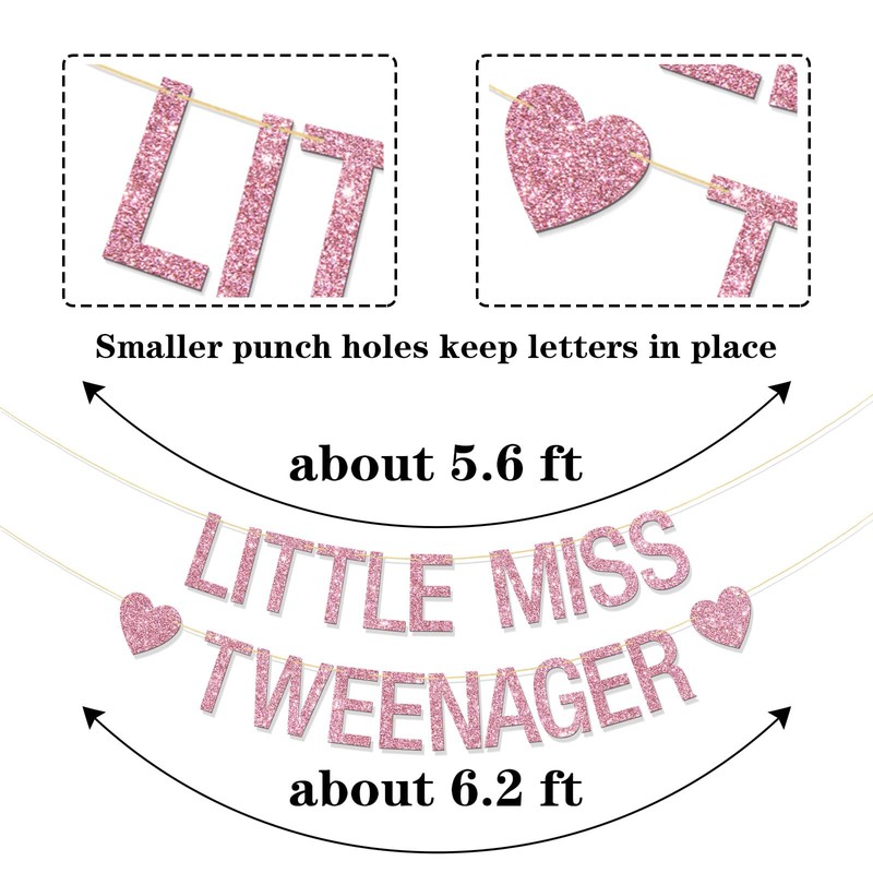 RoadSea Little Miss Tweenager Banner - 12th Birthday Party Supplies - Girl 12th Birthday Idea and Gift - Happy 12th Birthday Party Decorations - Pink Glitter