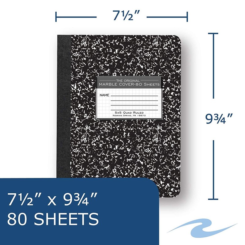 Record your notes in this Permanently bound composition book. Paper is smooth 15# writing paper with 5x5 graph Ruling. Covers are a hard white board that are printed in the traditional black marble pattern. Inside of covers is printed with class schedule and other useful information. Each book is produced with center-sewn and tape bound construction, not designed for sheet tear-out. Sheet size is 9.75" x 7.5" and there are 80 sheets per book. 4 books per pack, sold by the pack.