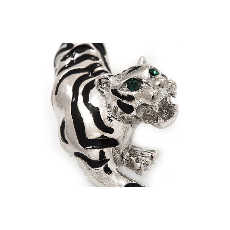 They say it's a wild world. Be prepared. Suit up in glamorous shimmer and versatile black and silver for savvy style that's safe in any urban jungle. The tiger crafted in polished rhodium plated metal and decorated with black enamel strips and emerald green crystal eyes. It measures about 6cm x 2.5cm and secures with a flag pin a revolver clasp.