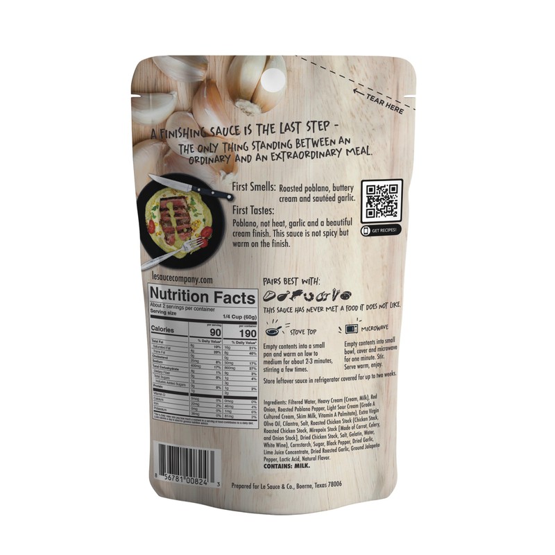 - Poblano Cream Sauce:: Create exceptional gourmet meals with Le Sauce Finishing Sauces. It has a rich, aromatic flavor that's not too spicy but warm on the finish. This Roasted Poblano & Garlic sauce will surprise you with the depth of its flavor. First, smell roasted poblano, sour cream, and sautéed garlic. Second, taste poblano, not heat garlic. It has layers of taste and aroma that can tickle your senses so that you can give your taste buds a treat.