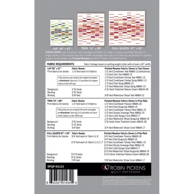 Kyoto Steps uses six fabrics (at 1/2 yard each for the Twin, 1/3 each for the Lap and 3/4 or 2/3 for the Full/Queen sizes) plus background fabric to make a modern quilt that focuses on larger panels in the central area and smaller rectangles that step out to the top and bottom in rythmic spaces. Lap, Twin and Full/Queen sizes (58 x 67, 74 x 89 and 97 x 93 inches).#RPQPKS126