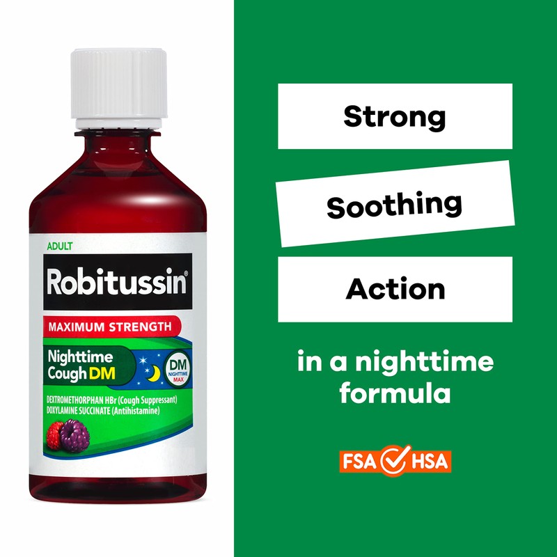 - One 4 fluid ounce bottle of Robitussin Maximum Strength Nighttime Cough DM, Cough Medicine for Adults, Berry Flavor