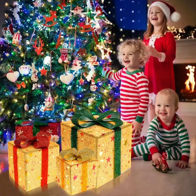 - đăGift Box Sizeă: Set of 3 luminous gift box Christmas with bow includes: S-16 x 16 x 16 cm, M-21 x 21 x 21 cm, L-26 x 26 x 26 cm. The gift box offers enough space to store gifts. You can hide gifts in it, surprise your family and friends and experience an unforgettable Christmas!