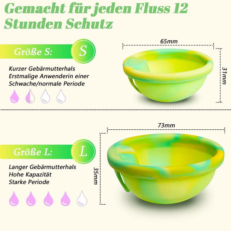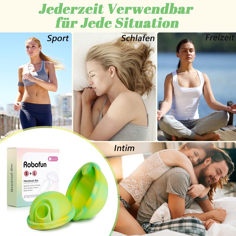 Robofun Wiederverwendbare Menstruationsscheibe Set, 2 Periodenscheibe (S+L), bis zu 12 Stunden, Menstruationsscheibe für leichte oder starke Regelblutung - Sicher bei Sport und Schwimmen - Grün